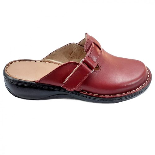 Ez a mély bordó női bőr klumpa a maximális kényelmet és a funkcionalitást ötvözi. A felsőrész egy hosszú tépőzáras pánttal készült, amely lehetővé teszi a bőség pontos beállítását, így magasabb lábfejre is tökéletes választás. A kézzel varrott bőrfelsőrész és a stabil, laposabb talpkialakítás gondoskodik a lábak pihentetéséről a hosszú munkanapok során.