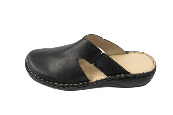 Ez a fekete női bőr klumpa a letisztult forma és a praktikus kialakítás jegyében készült. A felsőrész pántok és díszek nélküli, teljesen zárt és sima felületű. A kényelmes felvételt és a lábfej mozgásához való rugalmas alkalmazkodást a két oldalon elhelyezett kis gumis betét biztosítja. A kézzel varrott technológia és a kényelmi talp gondoskodik a lábak pihentetéséről a hosszú munkanapok során.