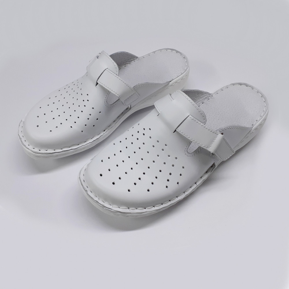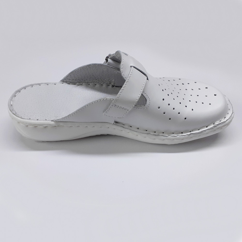 Ez a fehér női bőr klumpa a 7002-es széria legpraktikusabb darabja. A felsőrész lyukacsos (perforált) bőrből készült, ami biztosítja a láb folyamatos szellőzését a hosszú munkanapok alatt is. A rögzítésről egy hosszú tépőzáras pánt gondoskodik, amelyet egy ezüst színű fém gyűrűn vezethetünk át, így a szorosság tág határok között, a magasabb lábfejhez is igazodva állítható. A kézzel varrott technológia és a poliuretán talp maximális kényelmet és biztonságot nyújt.