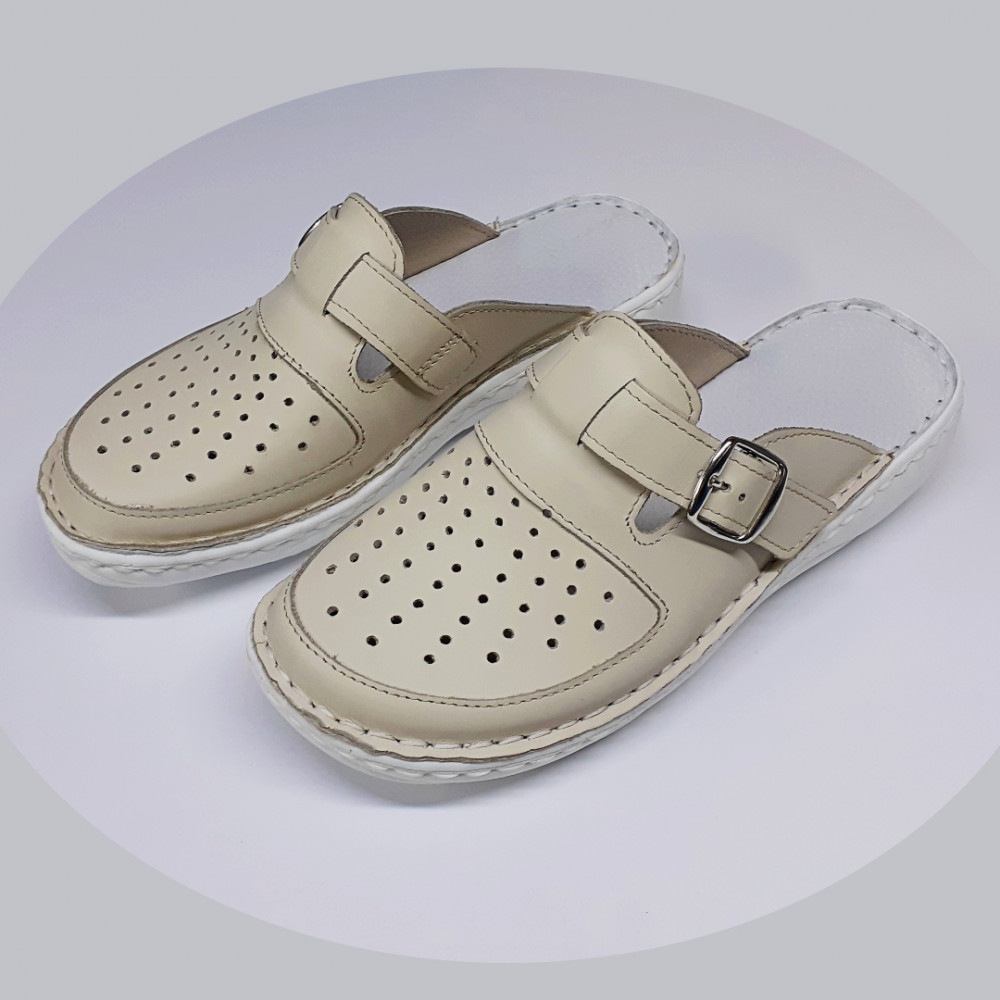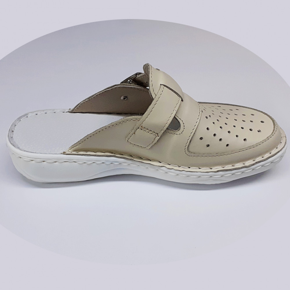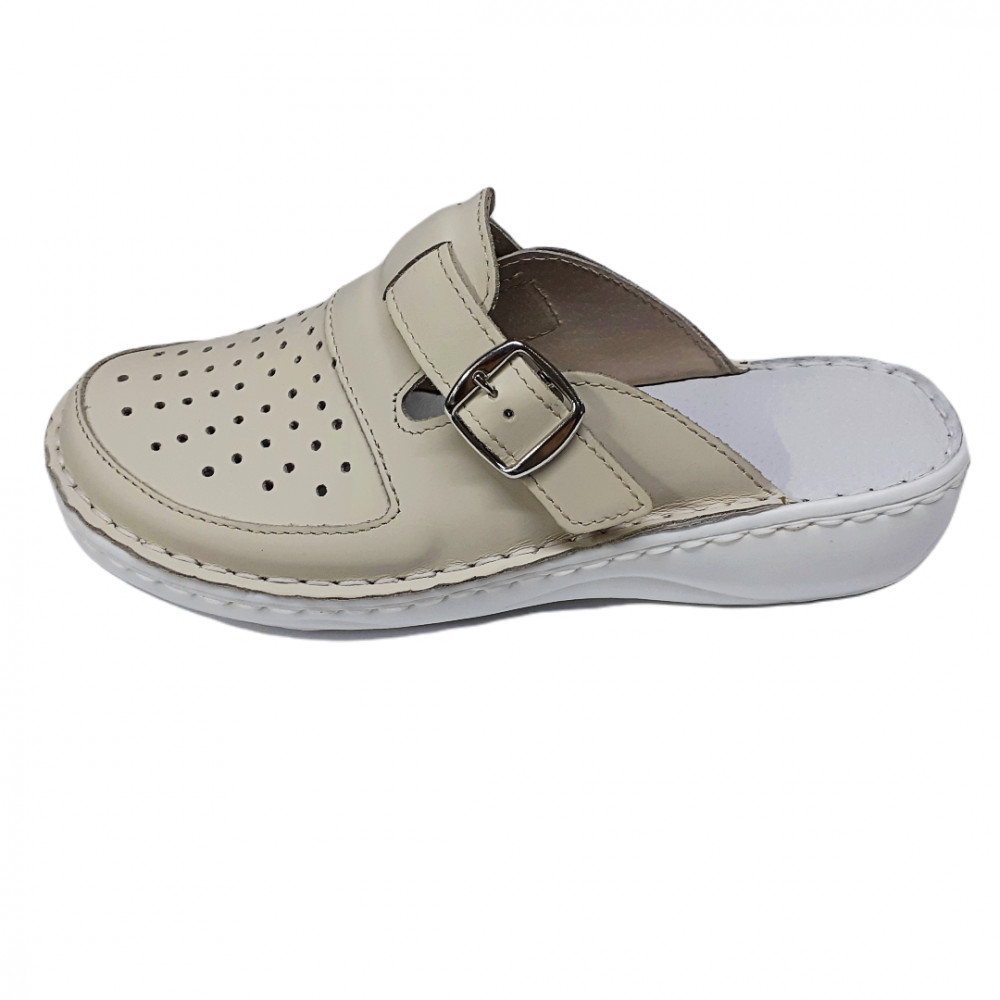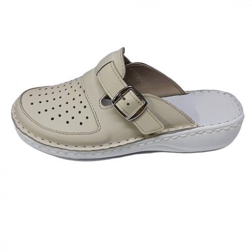 Ez a bézs női bőr klumpa a szellőzés és a biztos tartás ötvözete. A felsőrésze lyukacsos (perforált) bőrből készült, ami garantálja a láb frissességét. A lábbeli különlegessége a keresztben futó bőrpánt, amely egy fényes ezüst színű csattal záródik. Ez a csatos megoldás nemcsak stabil tartást ad, hanem elegáns dísze is a klumpának. A kézzel varrott szél és a kényelmi talp gondoskodik a láb pihentetéséről a hosszú napok során is.