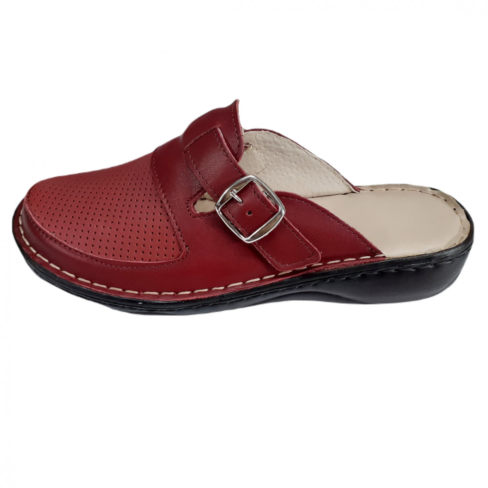 Ez a mélybordó női bőr klumpa a stílus és a funkcionalitás tökéletes egyensúlya. A felsőrész teljes felületén lyukacsos (perforált) bőrből készült, ami kiváló szellőzést tesz lehetővé, így egész napos viselés során is kényelmes marad. A modell jellegzetessége a lábfejen átívelő bőrpánt, amely egy fényes ezüst színű csattal záródik, lehetővé téve a bőség precíz beállítását. A kézzel varrott technológia és a stabil kényelmi talp gondoskodik a lábak védelméről és pihentetéséről.