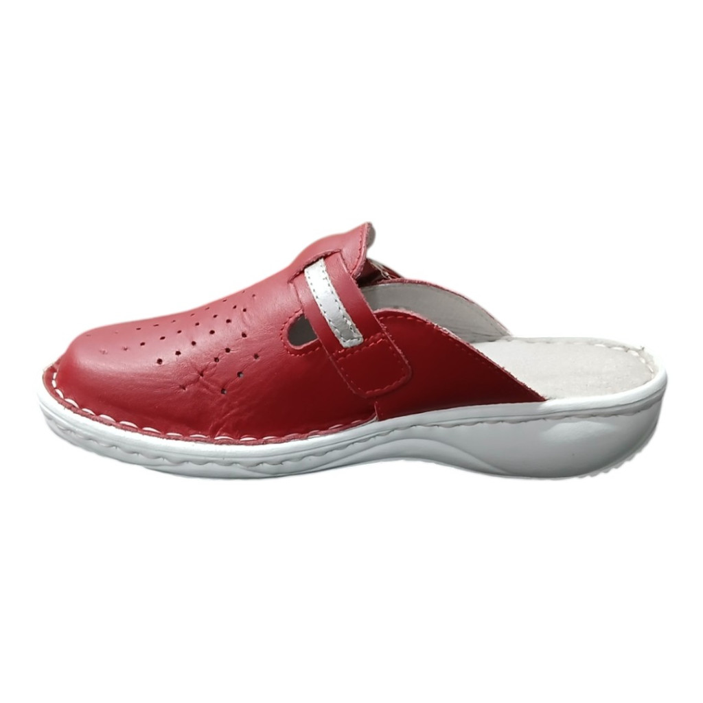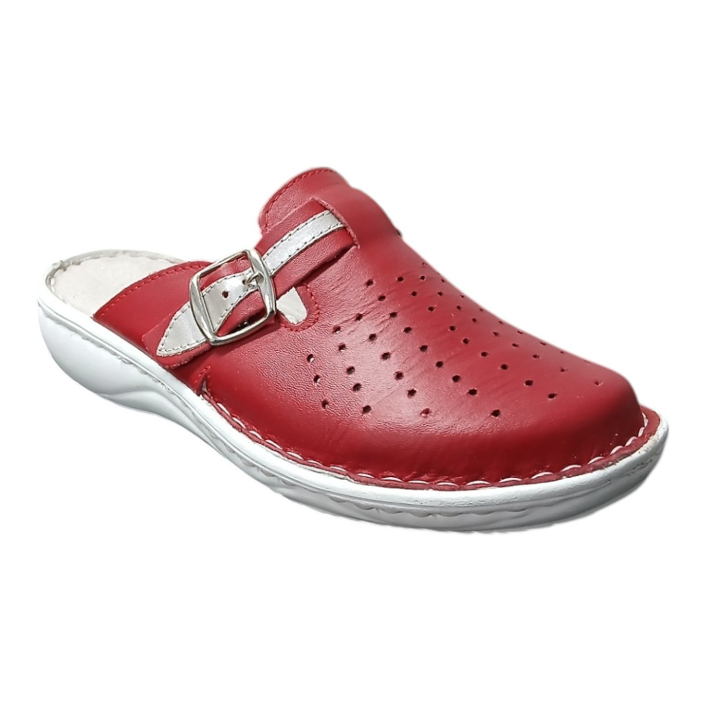 Ez a kézzel varrott, lyukacsos felsőrészű piros női bőr klumpa egy fix, díszes fémcsattal ellátott átlós pánttal és rugalmas poliuretán talppal készül a mindennapi kényelem érdekében.