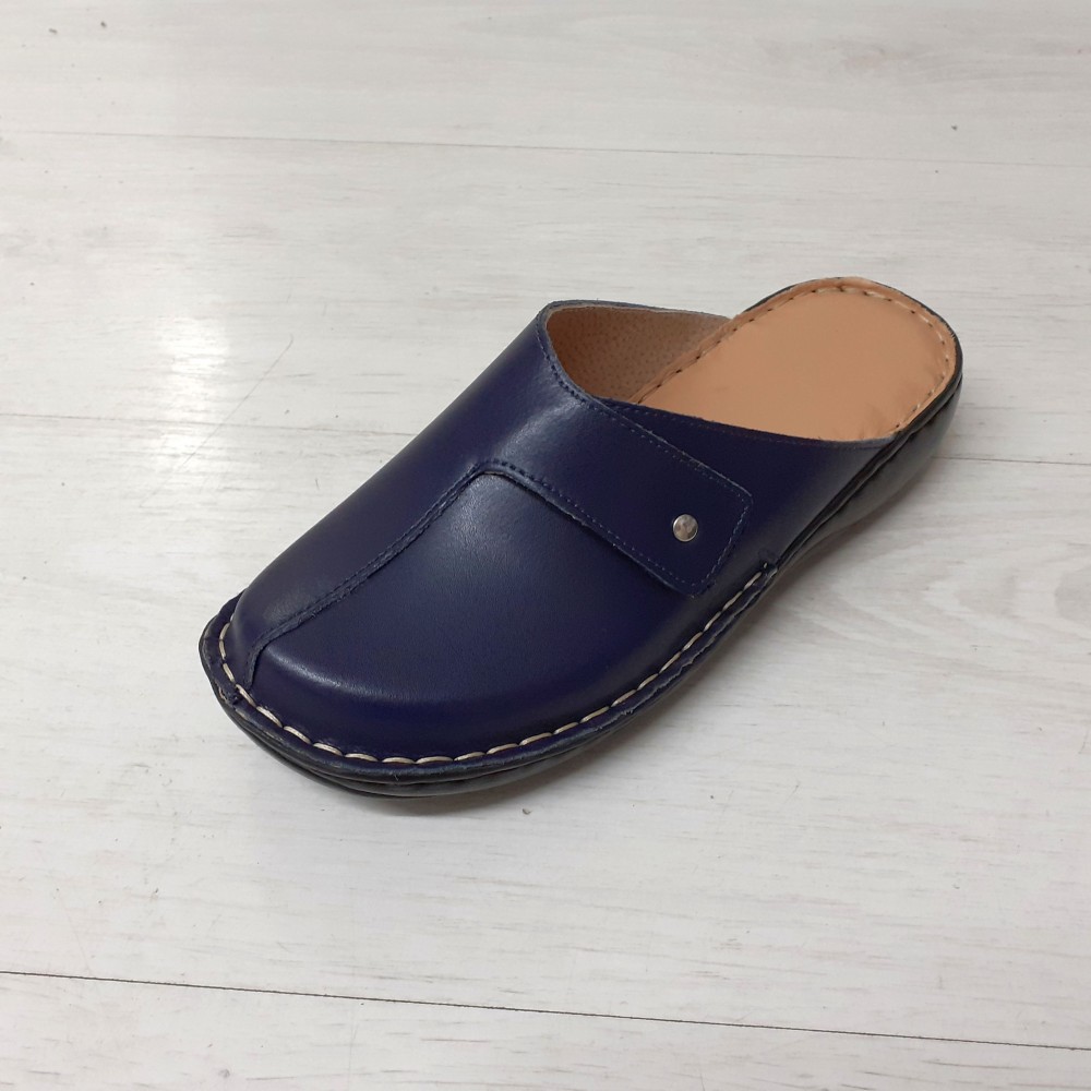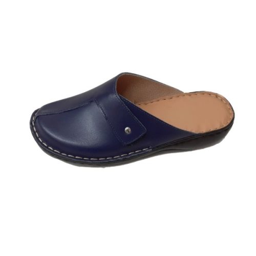 Ez a mélykék árnyalatú női bőr klumpa a lábfej bőségéhez igazítható praktikus tépőzáras pánttal és kézzel varrott kényelmi talppal biztosítja az egész napos stabil tartást.