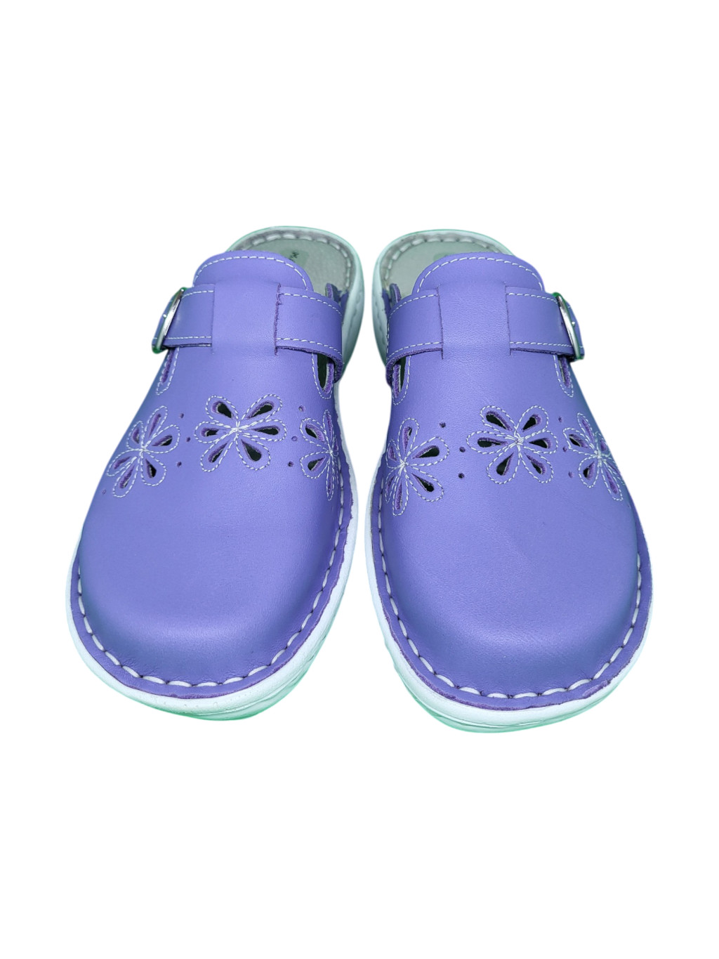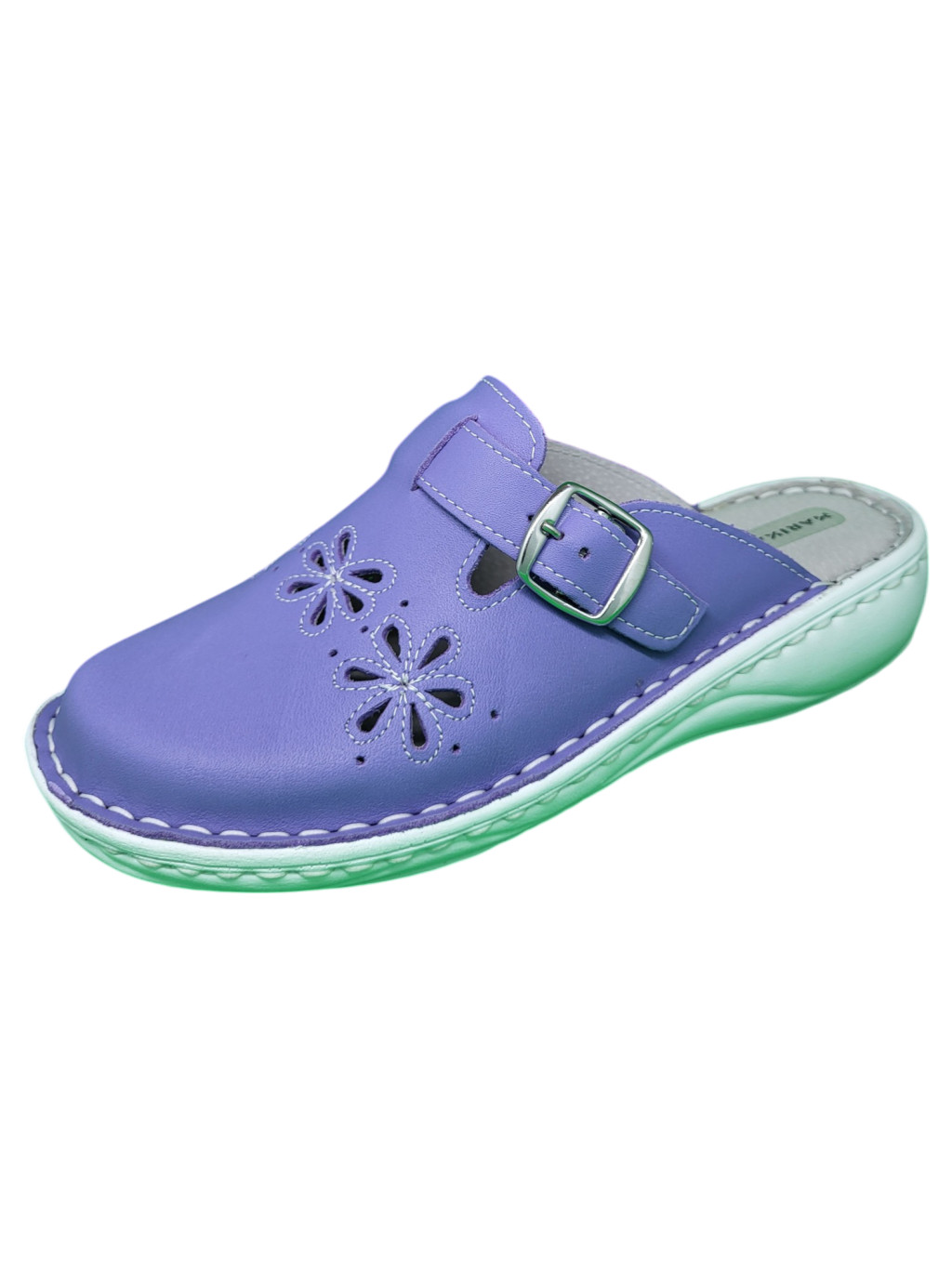 Ez a különleges iriszkék árnyalatú női bőr klumpa a lábfejen elhelyezett dekoratív áttört virágmintákkal és a bőség szabályozását lehetővé tevő csatos pánttal ötvözi az egyedi stílust a mindennapi kényelemmel.