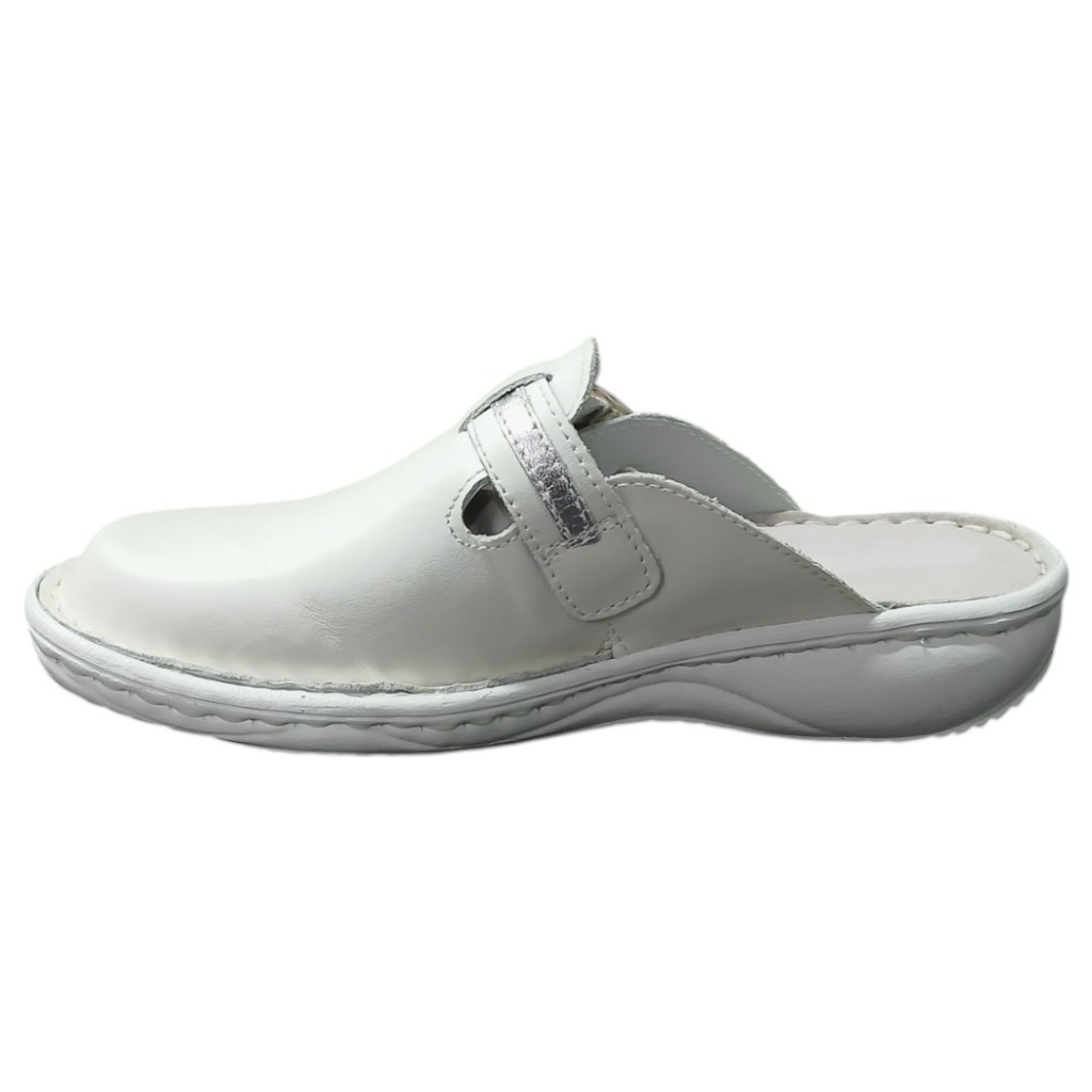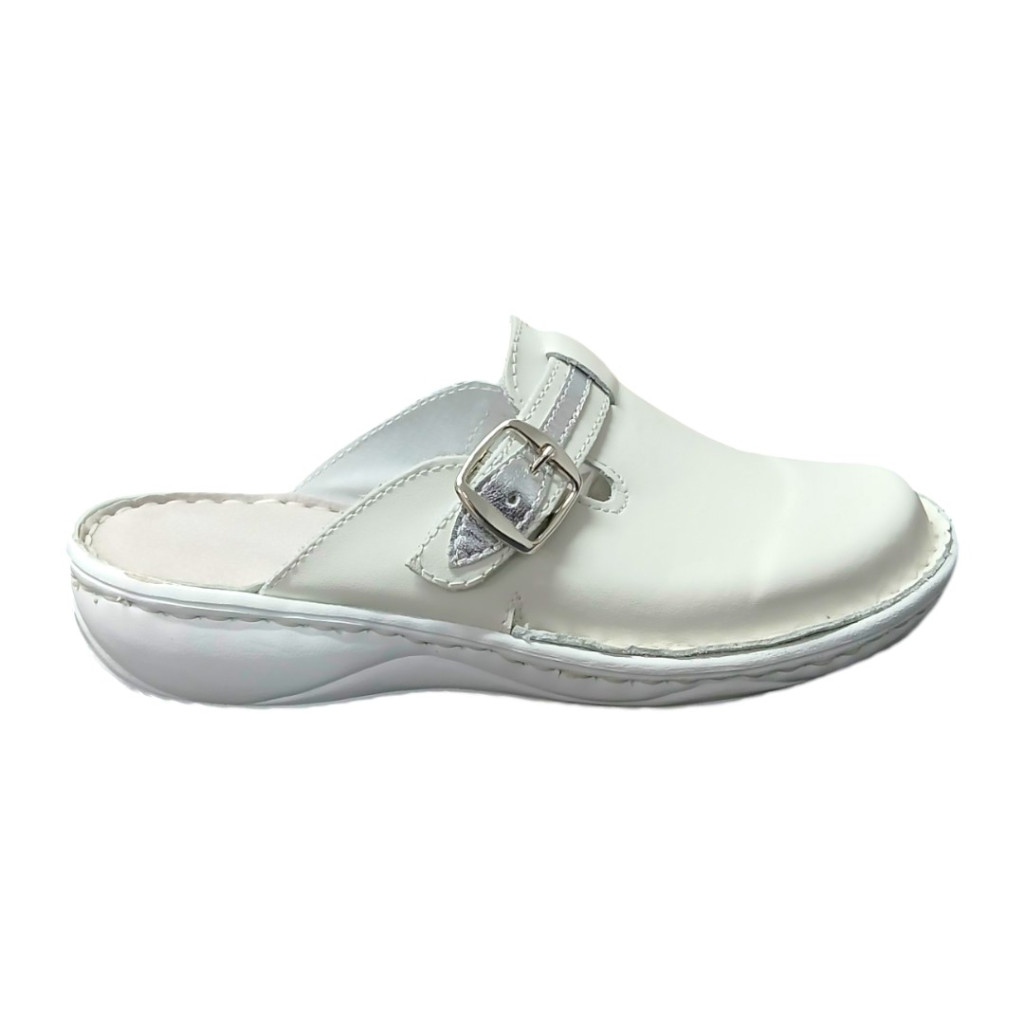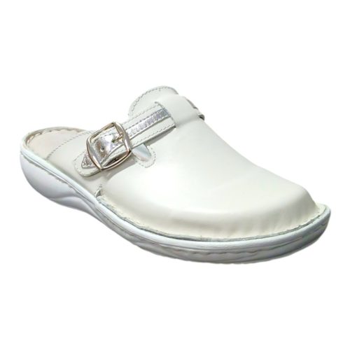 Ez a hófehér bőr felsőrésszel készült női klumpa az elegáns ezüstszínű díszítéssel ellátott csatos pántnak köszönhetően nemcsak stílusos, hanem a lábfej bőségéhez is tökéletesen igazítható.