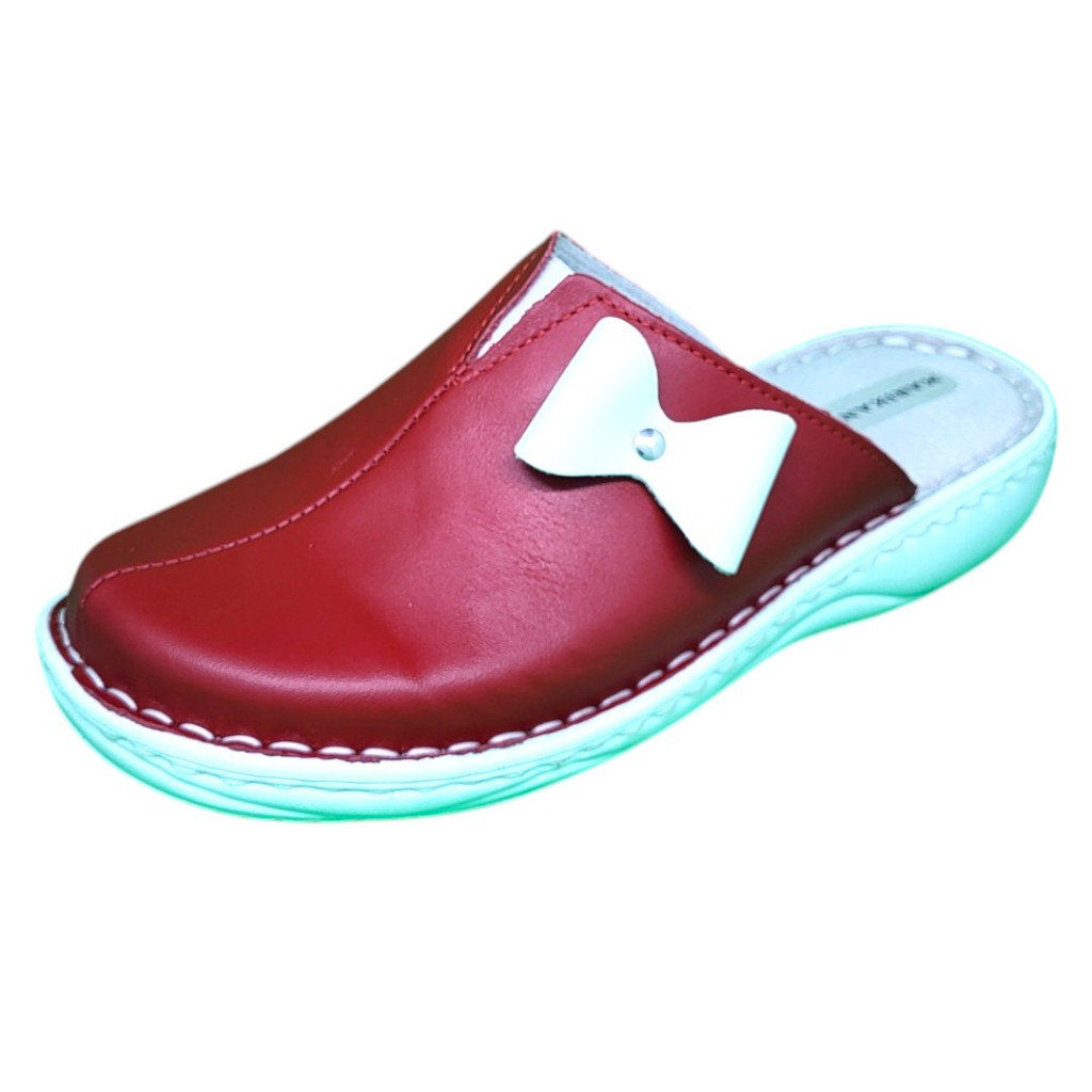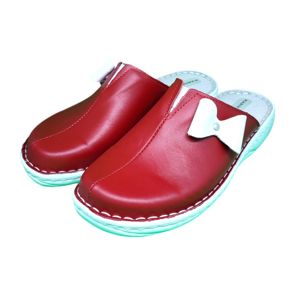 Ez a vibráló piros árnyalatú női bőr klumpa egy letisztult, elegáns modell, amelyet a lábfej oldalán elhelyezett nagyméretű, fehér masni díszítés és az azt rögzítő apró ezüstszínű gomb tesz igazán nőiessé.
